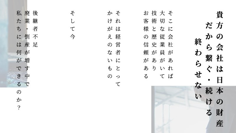 地域の中小企業に特化し、独立系M&Aアドバイザリーとして中立な立場でクライアントファーストな提案を実現。上場準備中の安定企業として全国へ拠点を拡大し、社会貢献性の高い事業で地域経済の活性化に貢献しています。