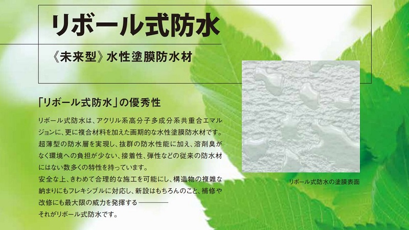 ビルの屋上から鉄道車両まで、幅広い用途に使用される水性塗膜防水材の専門メーカー。「リボール式防水」と称する自社開発の水性防水塗料は臭気を最小限に抑え、環境や施工者への安全に配慮した商品として高く評価されており、その特徴から浴室や病院、住宅密集地などで広く採用されている。